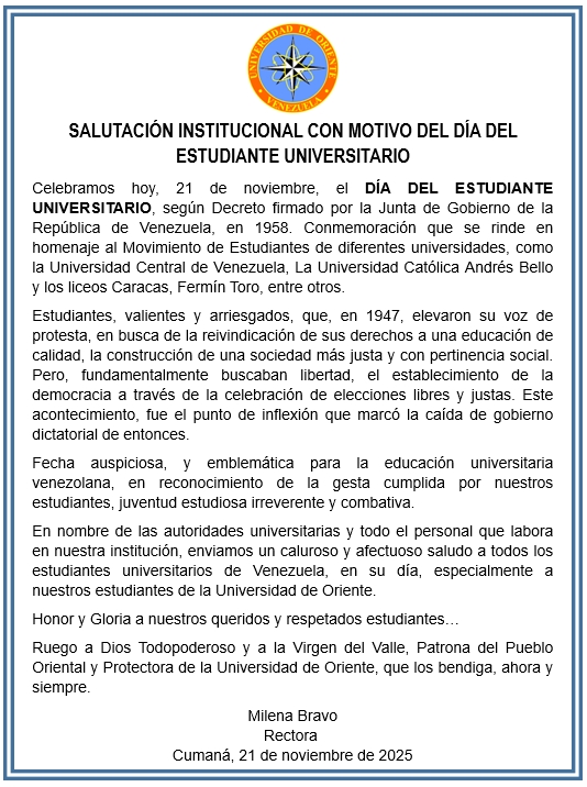 Salutación institucional con motivo del 67 aniversario de la Universidad de Oriente